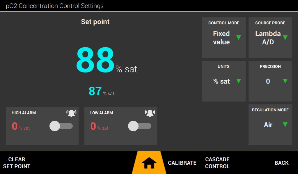 - pO2 Control: Sterilizable, fast-response Clark-type oxygen sensor, automatic temperature correction, two-point calibration, dissolved oxygen (DO) control via airflow regulation or cascade controller. Range: 0 to 25 mg/L oxygen, in 0.1 mg/L increments, saturation 0 to 100% (adjustable units) | Resolution: 0.1 or 0.01 (adjustable) | Analog probe type: Fast-response, sterilizable Clark-type LAMBDA oxygen sensor | Digital probe type: Hamilton ARC technology (Clark type or optical)